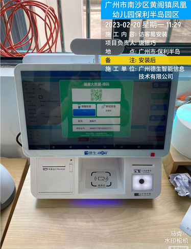 时过境迁,在经过3年的努力抗战,人们已经迎来了后疫情时代,纷纷摘下口罩,走向大街;但对于幼儿园等特殊场所来说,由于孩童的抵抗力还比较弱小,对病毒的侵害仍然不具备较好的抵抗力,为了保障儿童的健康生命安全。广州市南沙区黄阁镇凤凰幼儿园保利半岛园区,向德生引进了德生访客机,在访客登记,实名核验的基础上,通过增加健康码核验的功能,在保障来访人员的实名信息核验的同时,还保障了健康信息的核查。