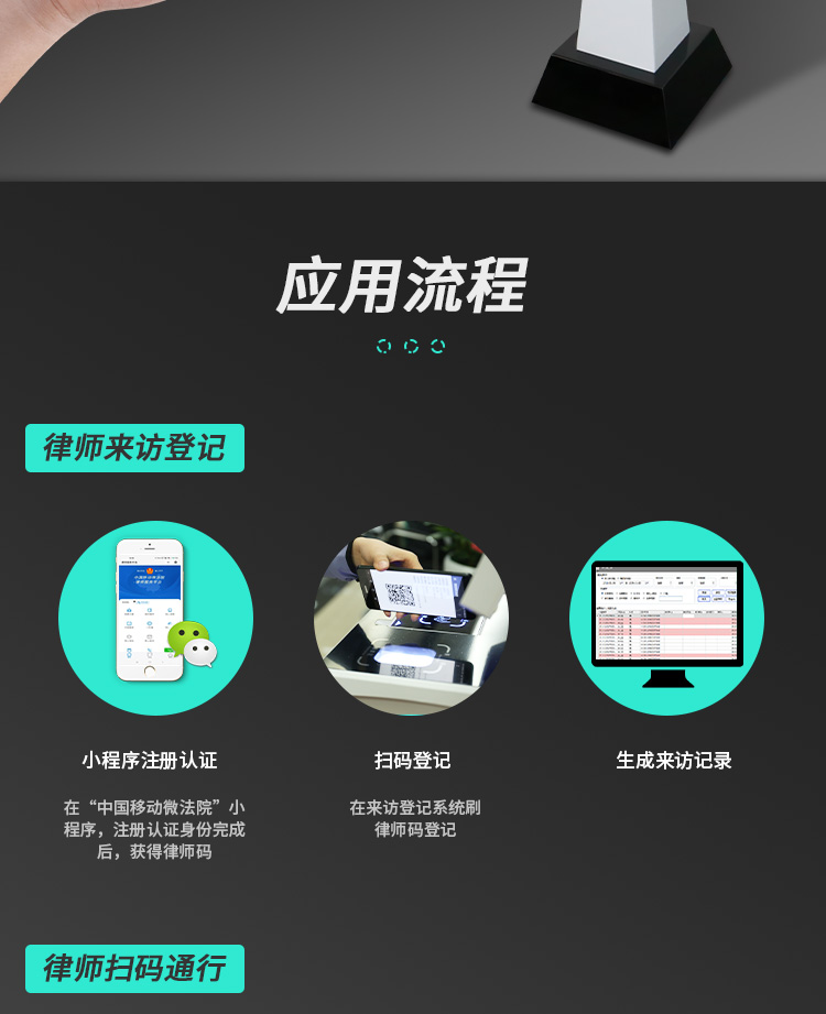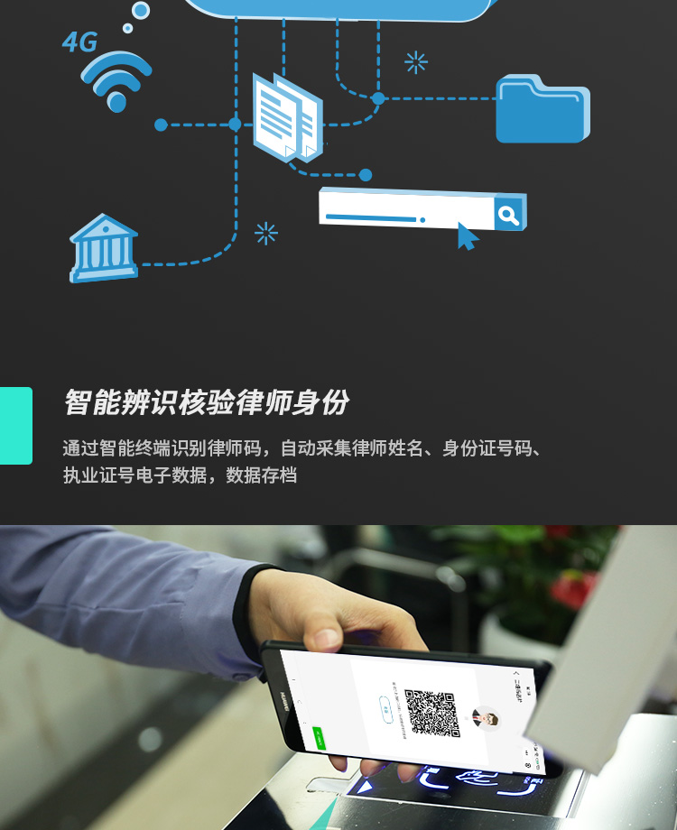 德生人脸识别律师验证设备,可以刷动态律师码、人脸识别、体温测量等,自动显示律师的身份信息,包括律师姓名、执业机构、执业证号、年度考核、执业状态、律师照片等。