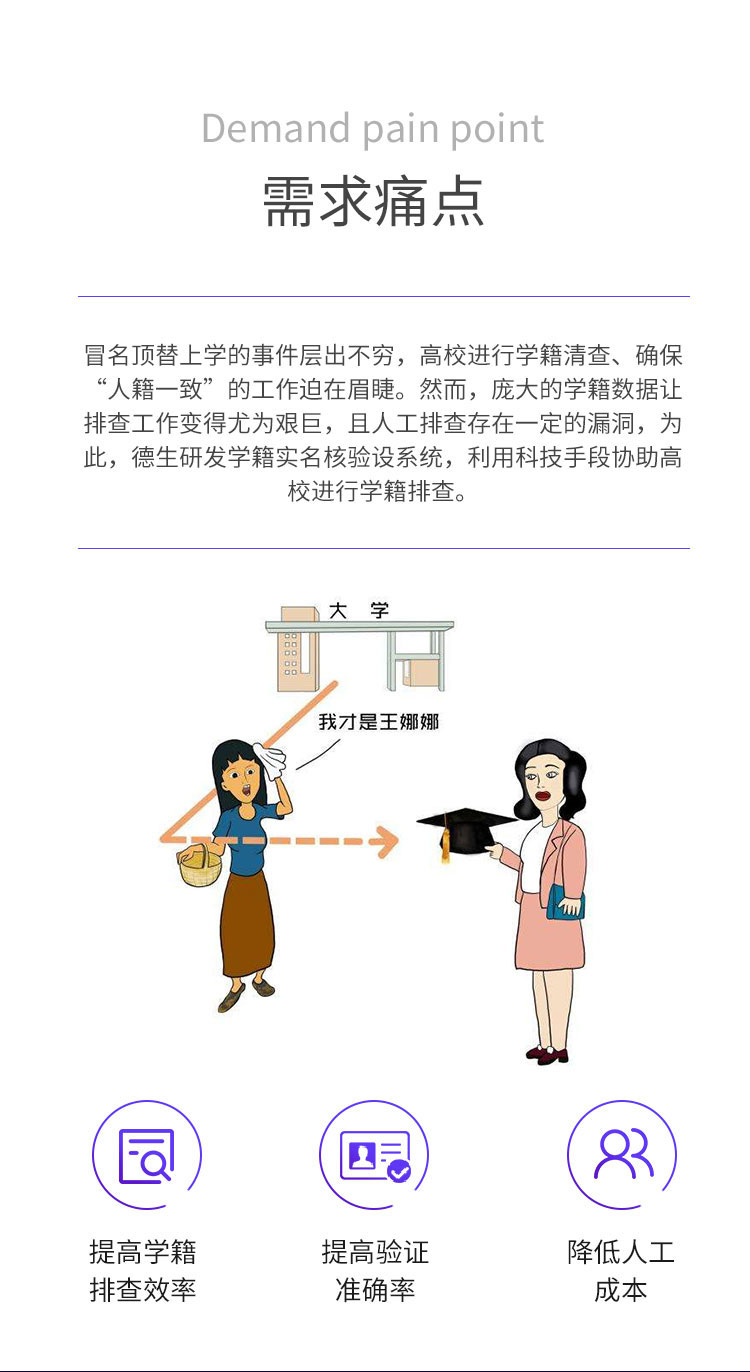 冒名顶替上学的事情,层出不穷,高校进行学籍清查、确保人、证、学籍一致的工作迫在眉睫。然而,庞大的数据让排查工作变得尤为艰巨,且让人工排查存在一定的漏洞,为此,德生推出人证合一的学籍实名核验系统,读取身份证基本信息,现场拍照与身份证上的照片、学籍照片、学籍信息进行比对,进行人、身份证、学籍的三方比对,杜绝冒用他人身份证注册上学!
