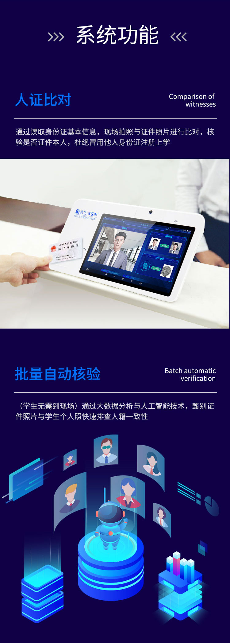高校新生入学三方比对,人、身份证、学籍进行三方核验比对,防冒名顶替,可以对接学籍系统,数据平台管理