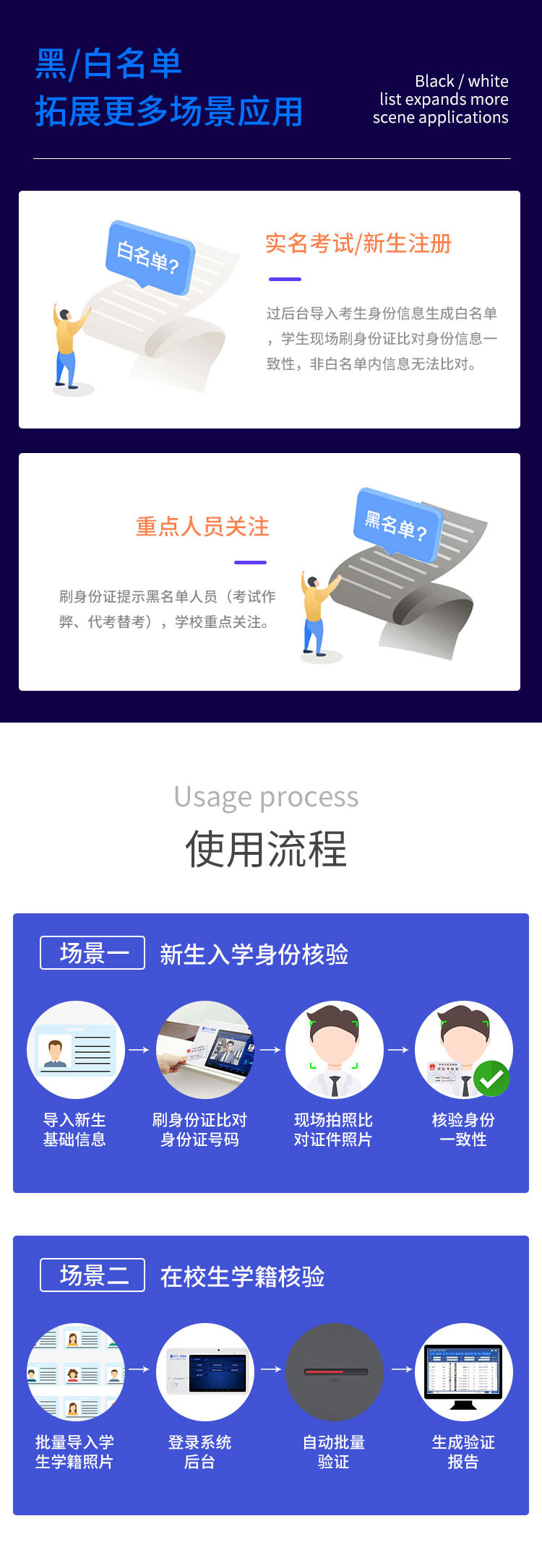 身份证证件照、现场人脸照、学籍照片三方核验,多重验证,解决冒名顶替上学/替考问题;