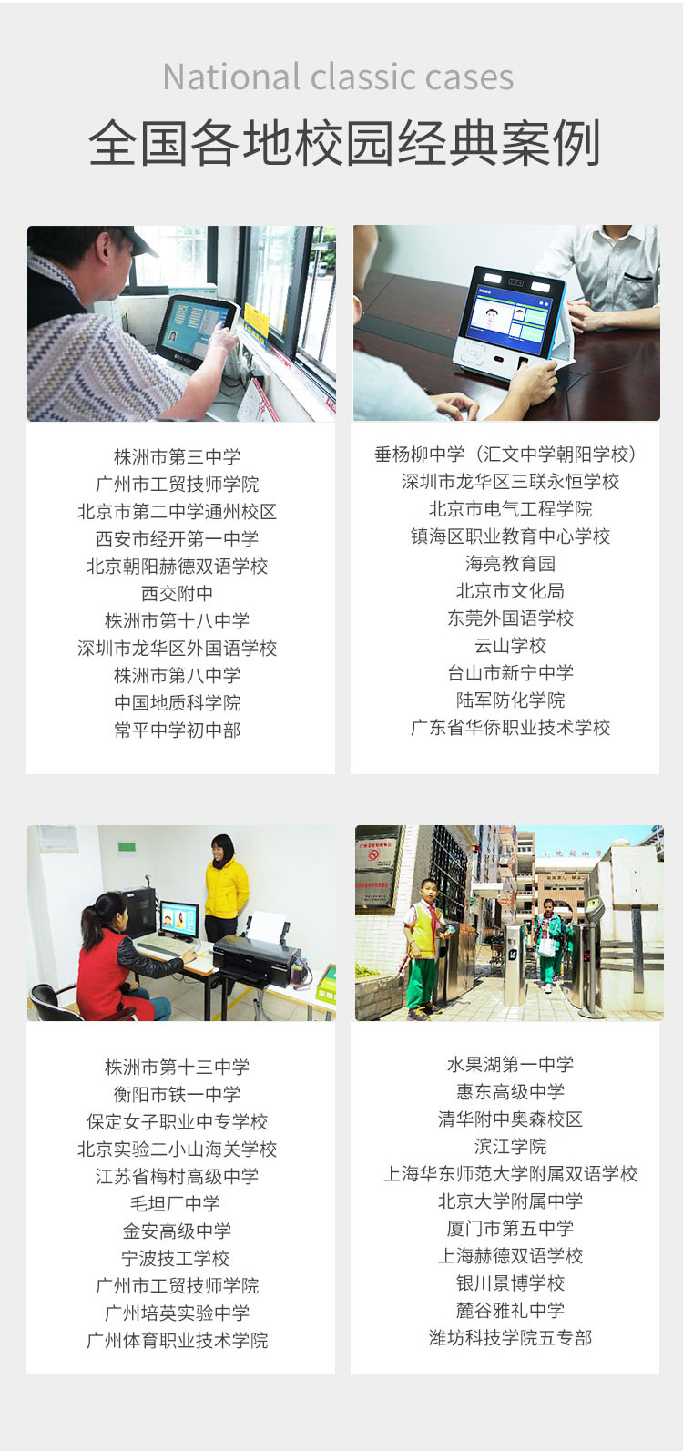 3、实名验证,学生现场在验证终端上刷身份证,自动读取身份证信息和身份证照片,与现场抓拍的人脸照片、事先导入的学生学籍照片,三者比较,核验人证一致;
