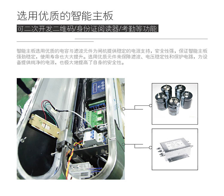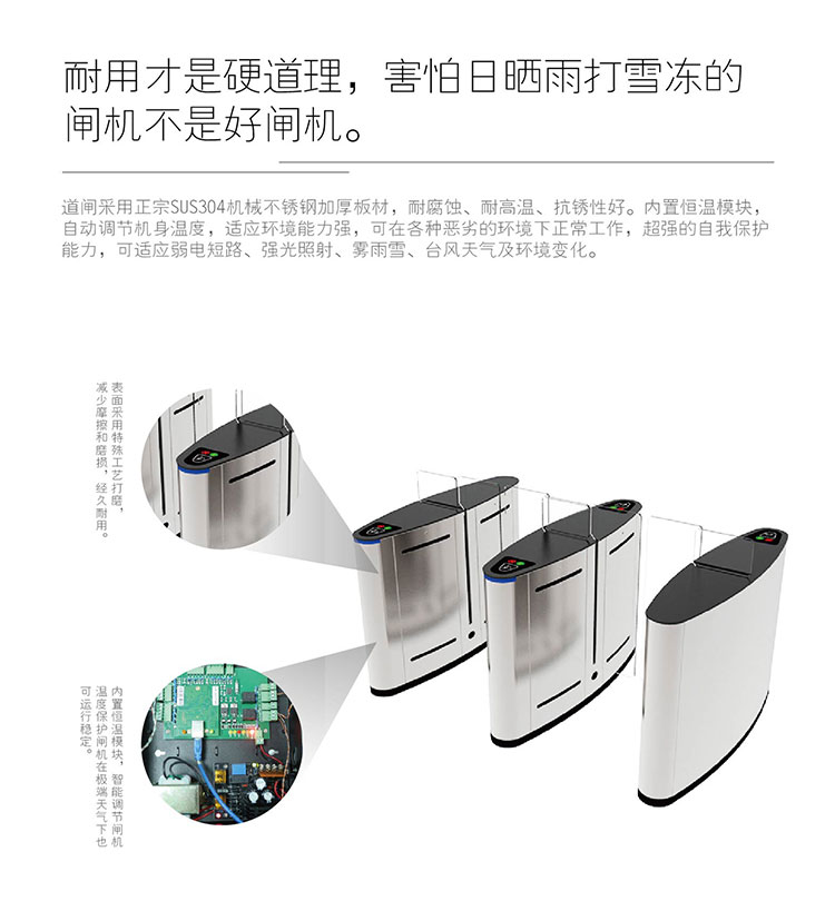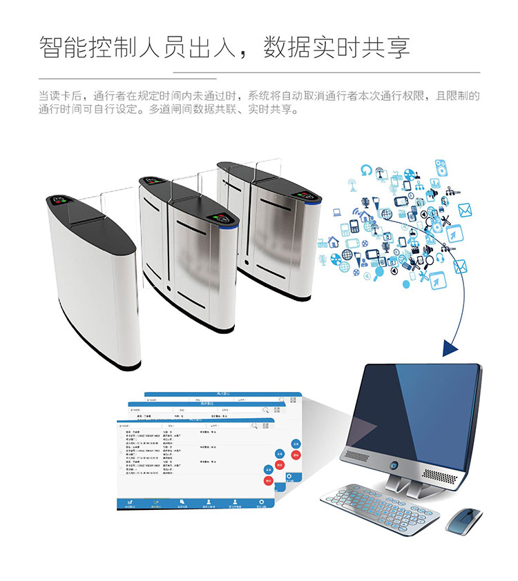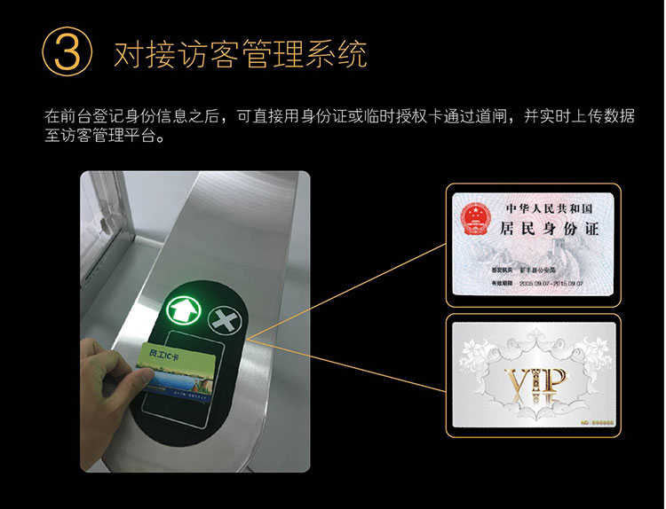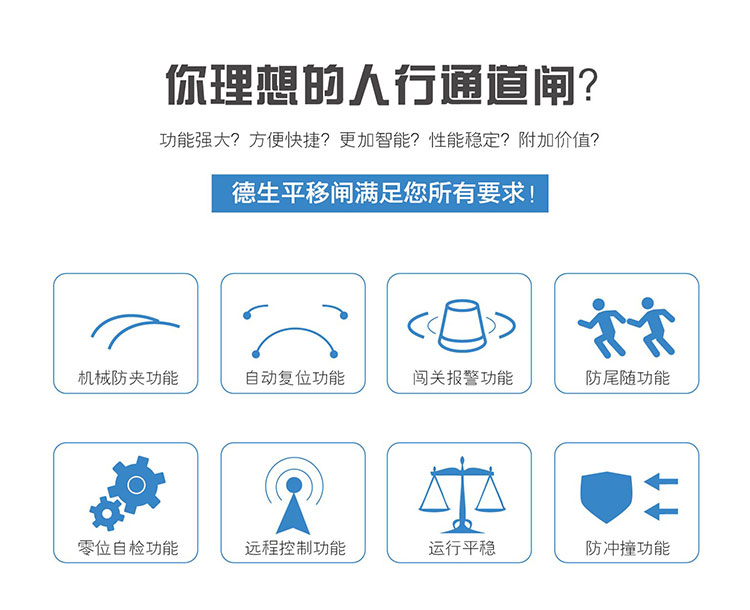 功能模块:平移闸、通道控制器、二合一读卡器、二维码扫描器器、维根转换器;系统功能:身份证和IC卡、二维码自动进出道闸系统;产品特点:防尾随、防冲撞、远程控制、自动复位、应用于写字楼、会所、酒店、政府机关等场合