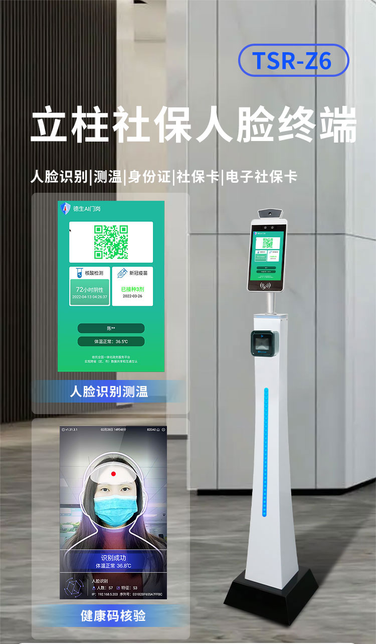 立柱社保人脸终端TSR-Z6支持刷身份证、社保卡、人脸识别、人证比对等功能与多系统兼容,且部署便捷K8凯发获取最优报价!
