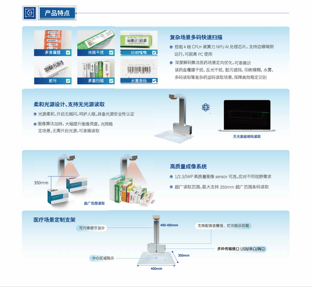德生医保支付溯源码批量扫码终端是一款专门为医院药品管理设计的智能设备。它搭载了超高性能多核 AI 芯片,具备强大的运算和处理能力,能够快速应对医院大量药品扫码的需求。结合医药行业专用解码和图像处理技术,对医院各种药品的追溯码,无论是常见的条形码、二维码,还是特殊规格的药品监管码,都能实现精准识别和快速读取。这种智能型识别技术不仅提高了扫码的准确性和效率,还为医院药品的全流程追溯管理提供了可靠的技术支持。