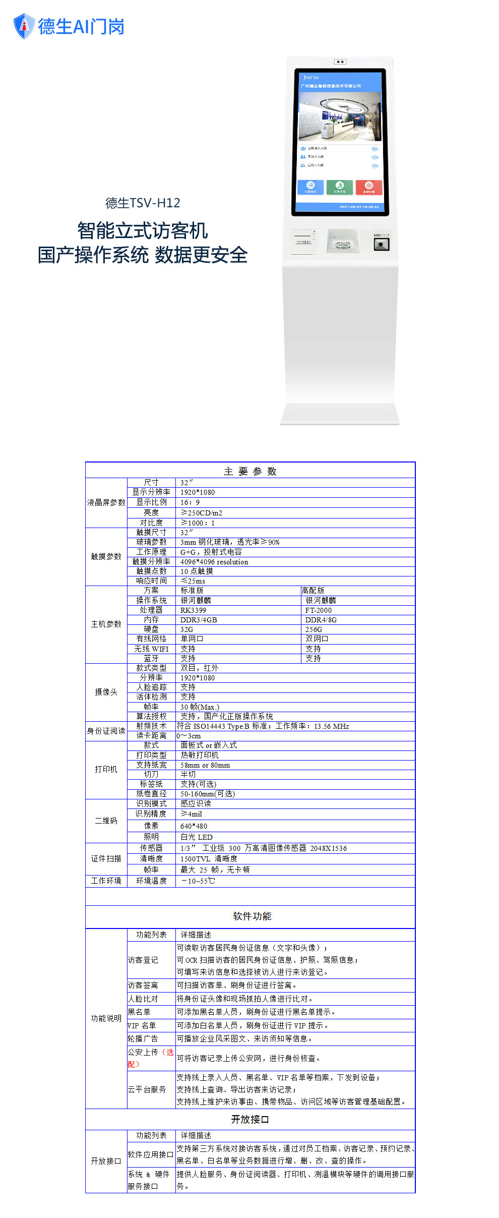德生TSV-H12立式访客机。国产操作系统,方便预约来访,自助登记