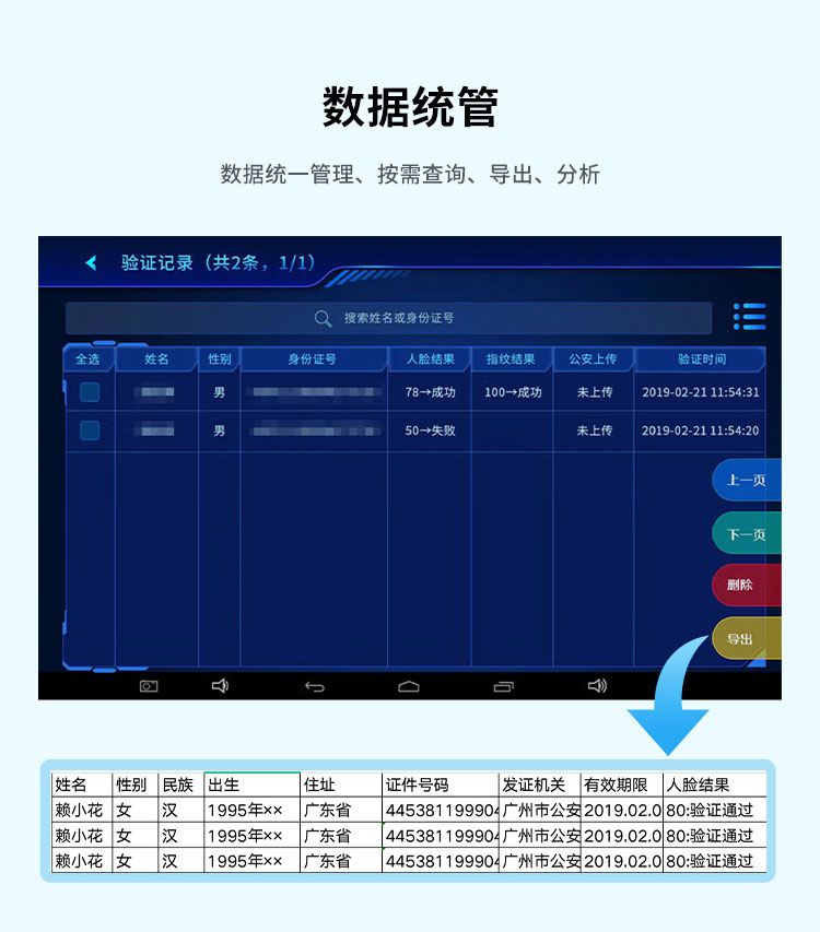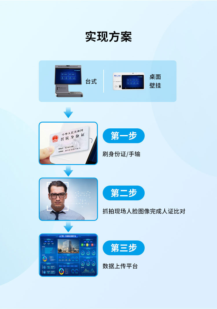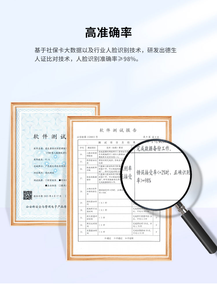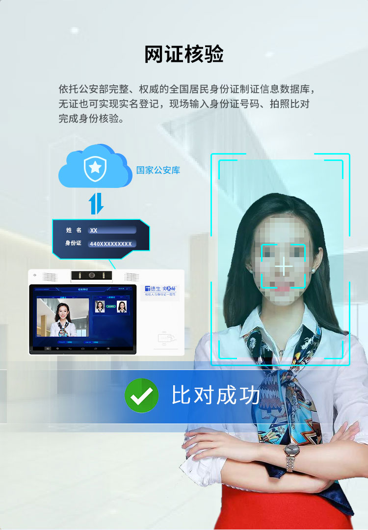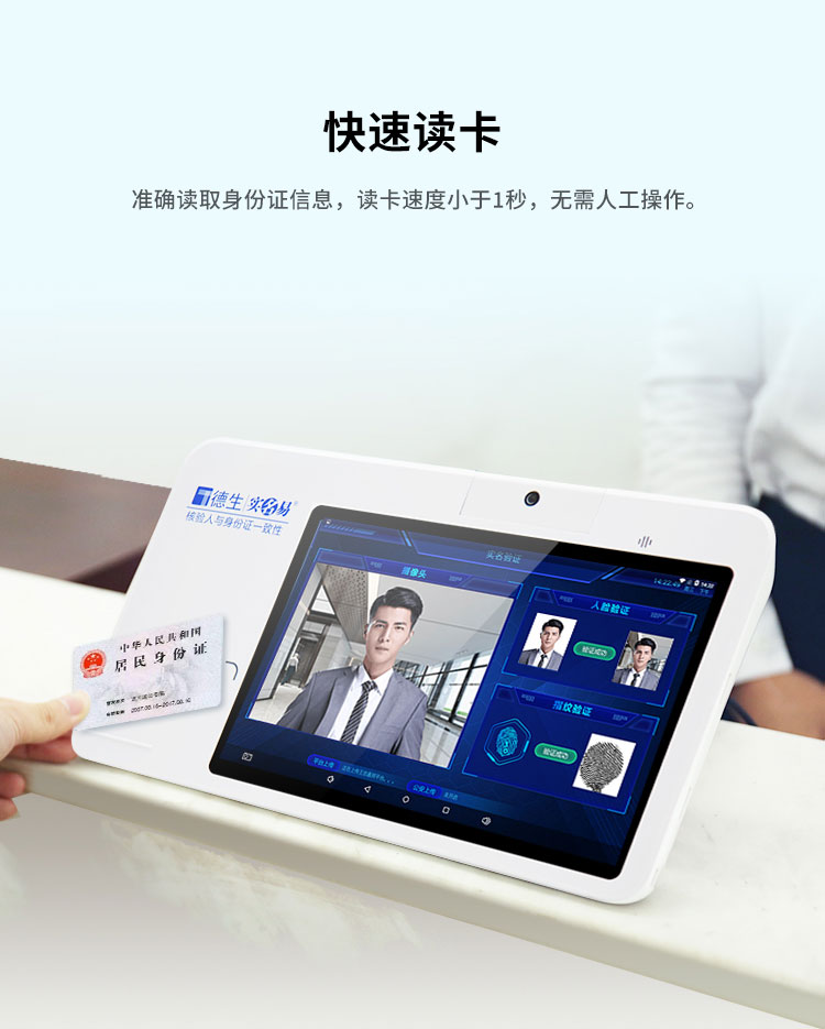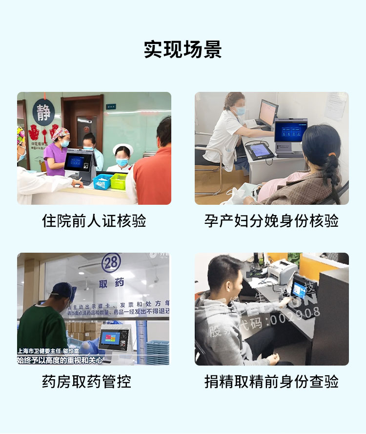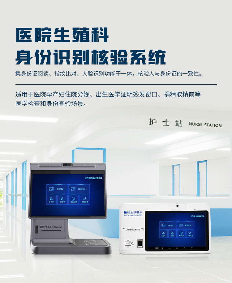 集身份证阅读、指纹比对、人脸识别功能于一体,核验人与身份证的一致性。适用于医院孕产妇住院分娩、出生医学证明签发窗口、捐精取精前等医学检查和身份查验场景。